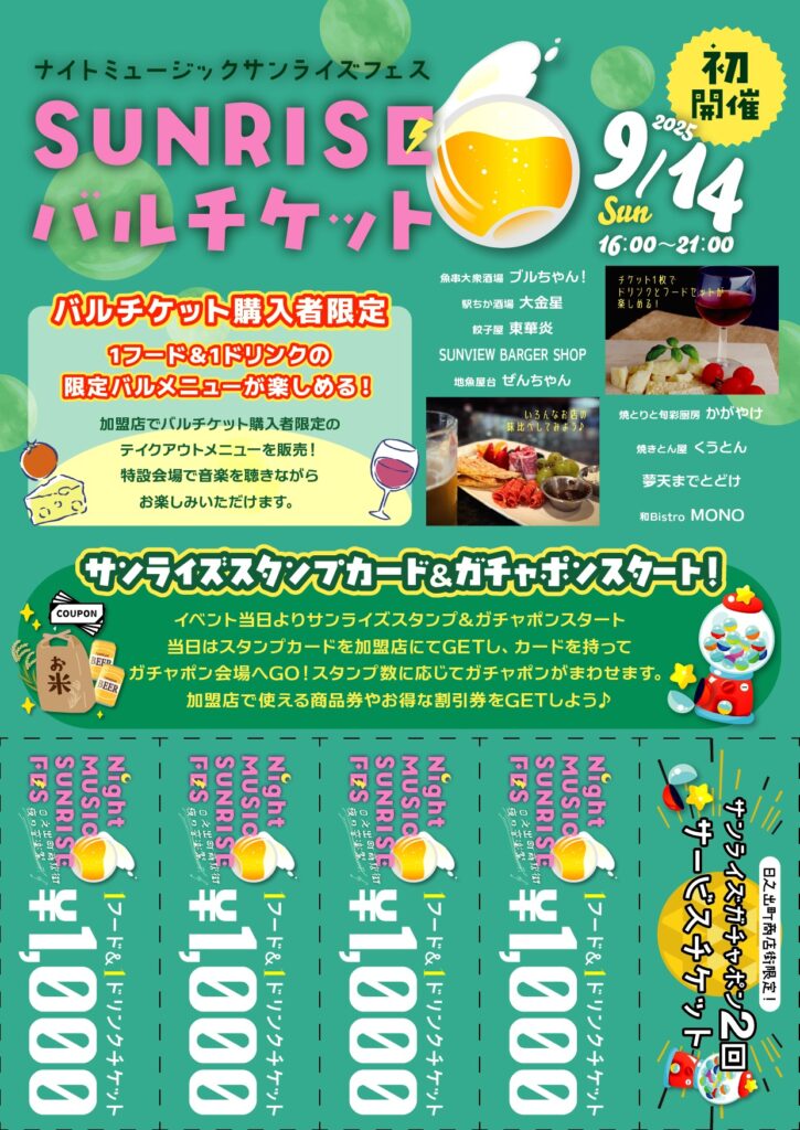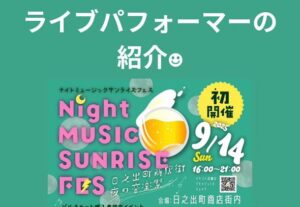 2025年9月14日(日)16時より日之出町商店街内にて音楽フェス&グルメイベント「ナイトミュージックサンライズフェス」が初開催✨
